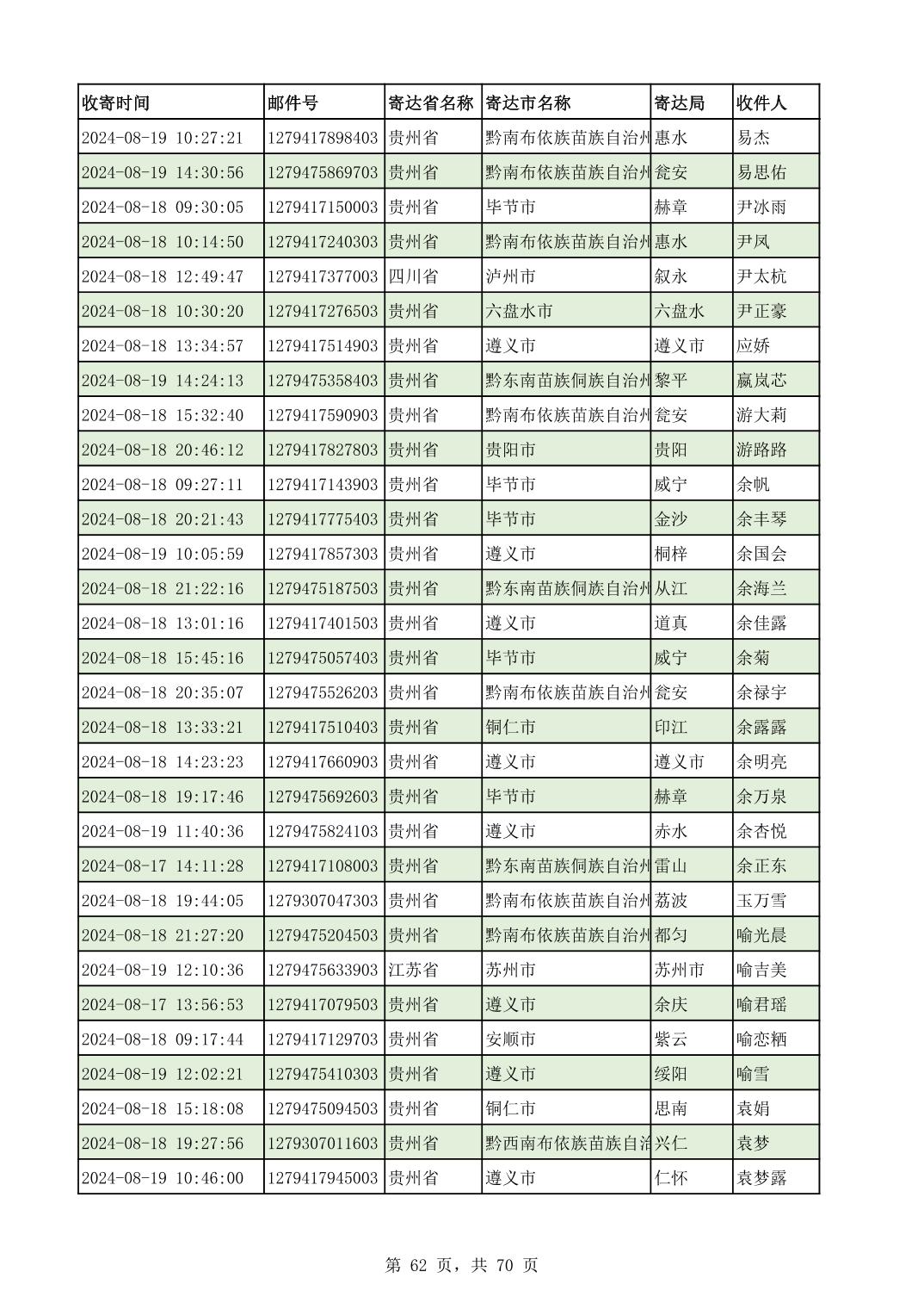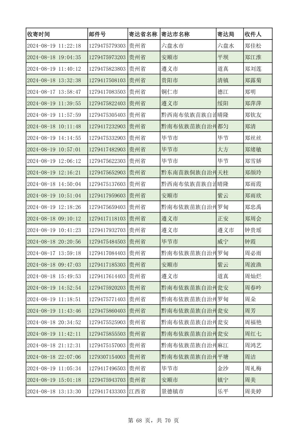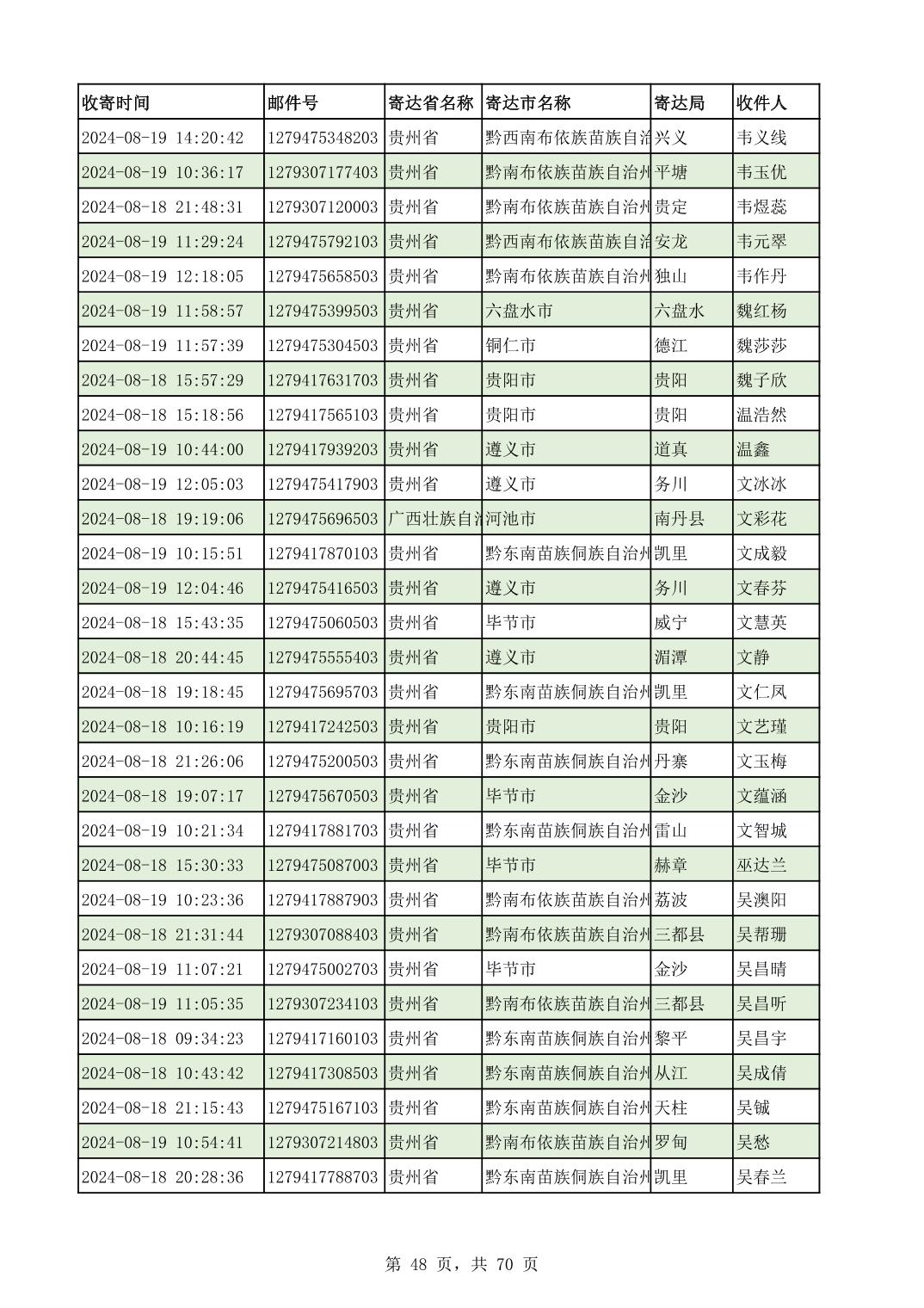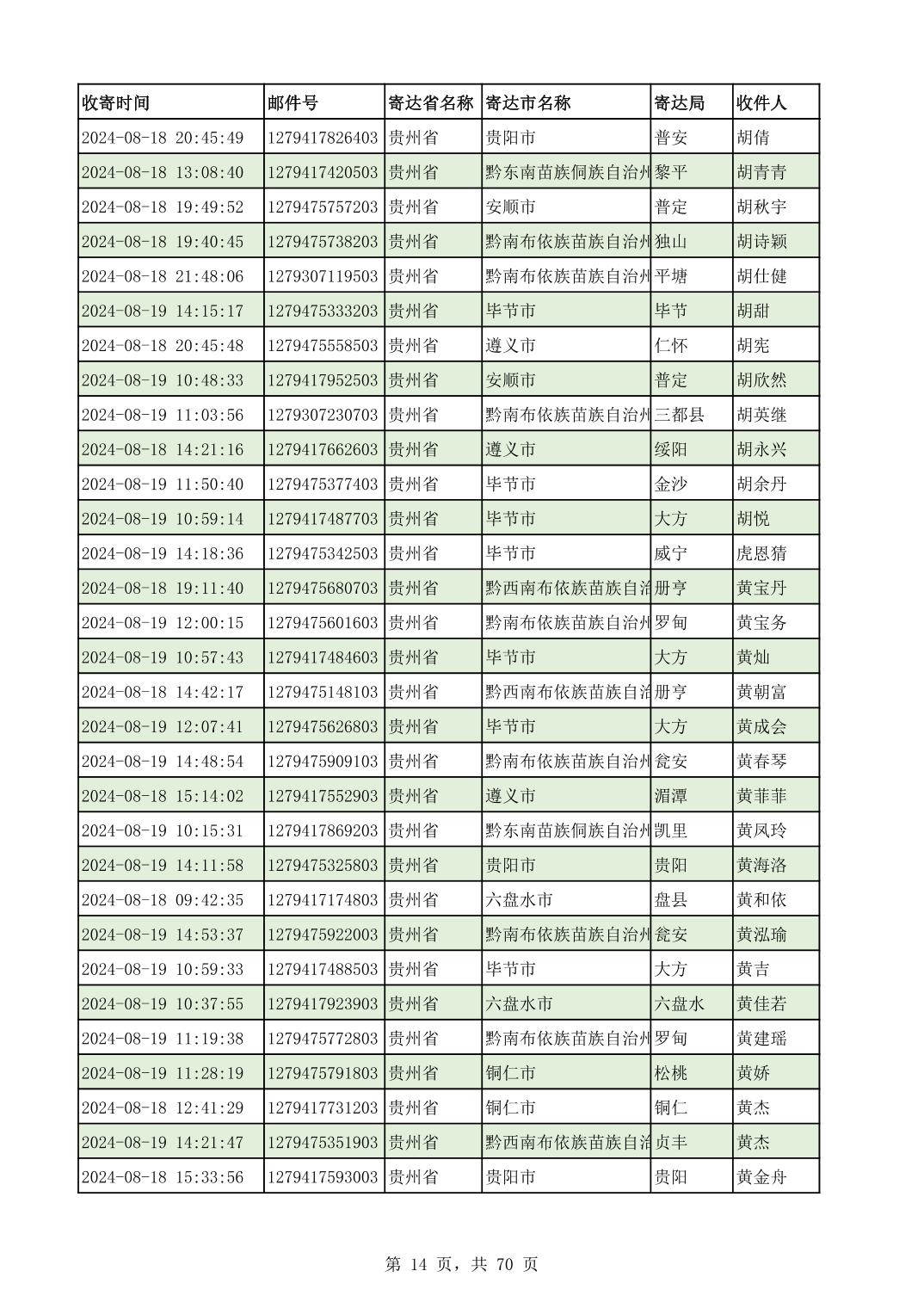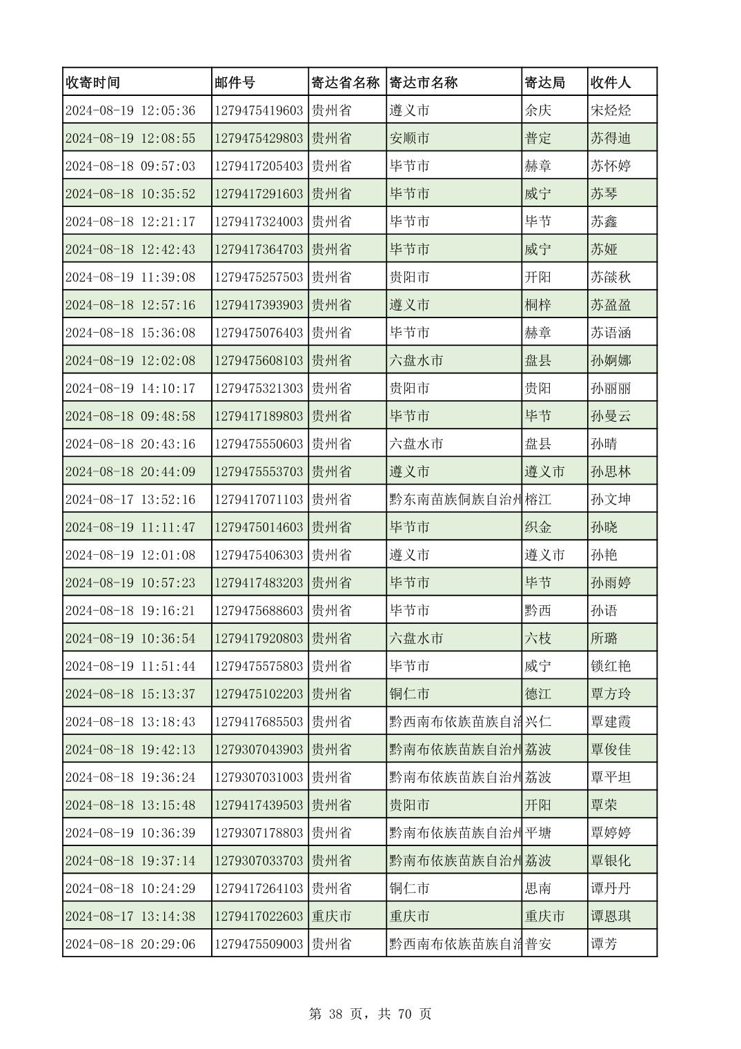 黔南幼专2024年录取通知书邮寄单号8月19日(按姓名拼音首字母排序)