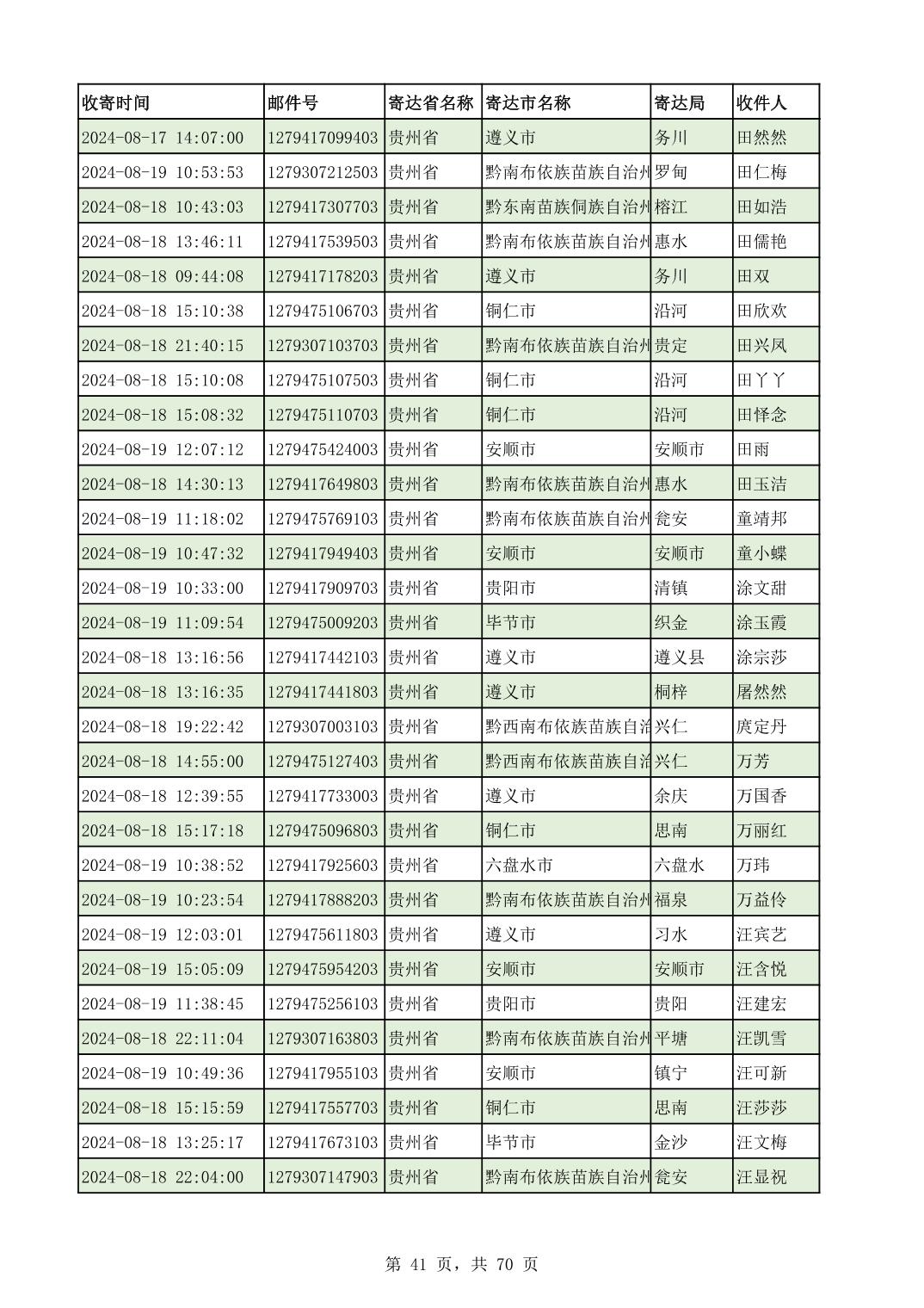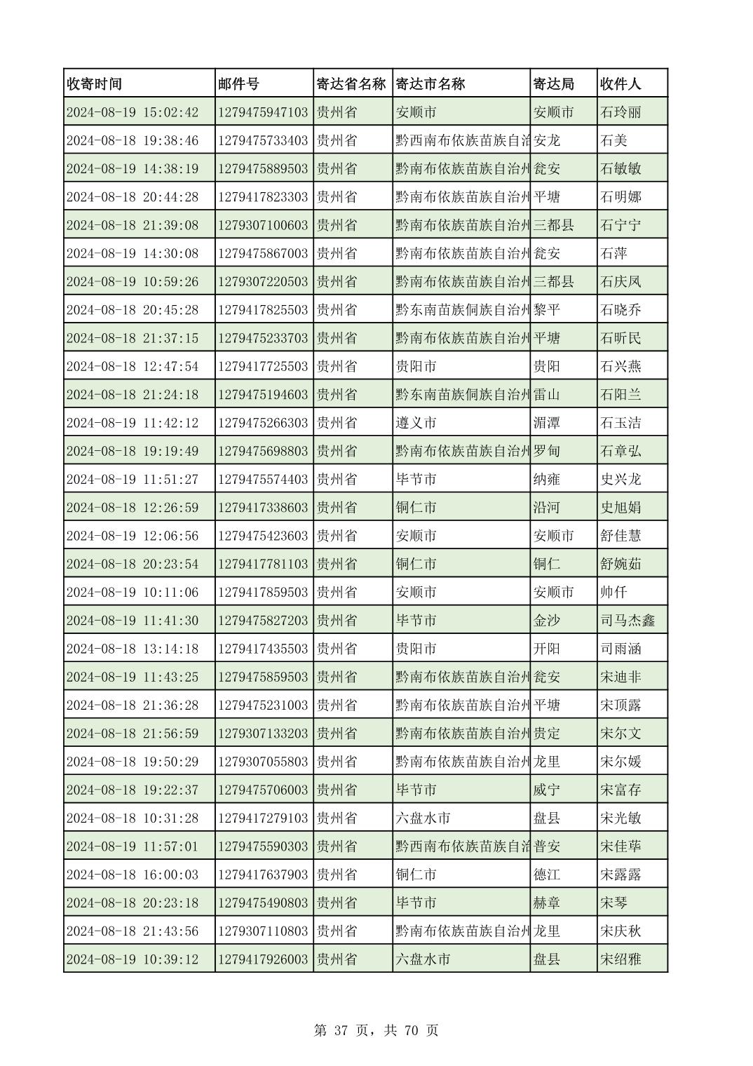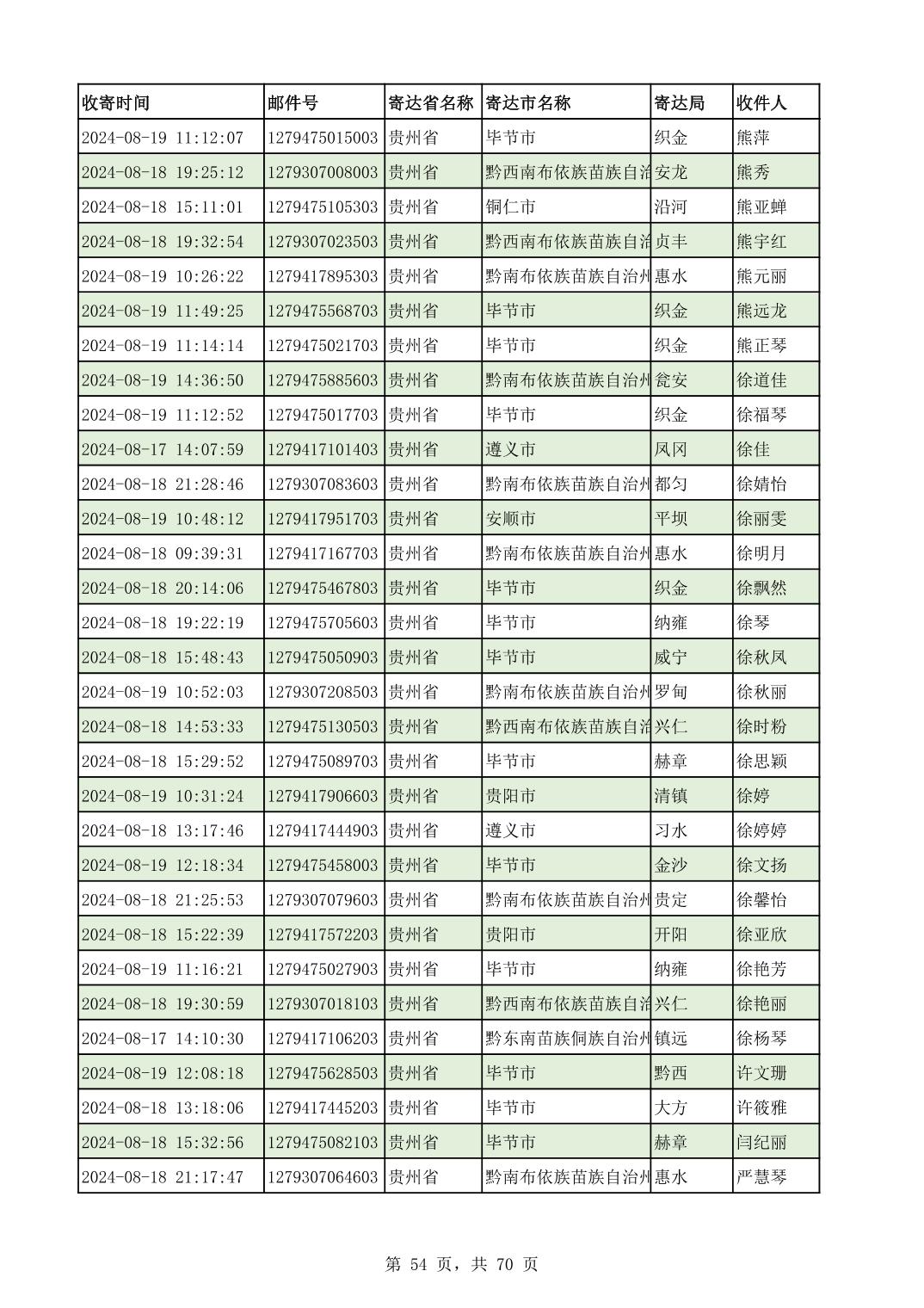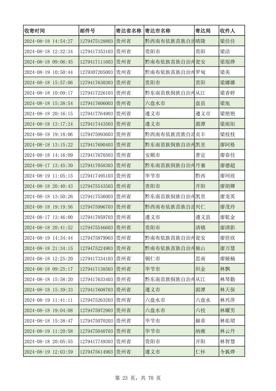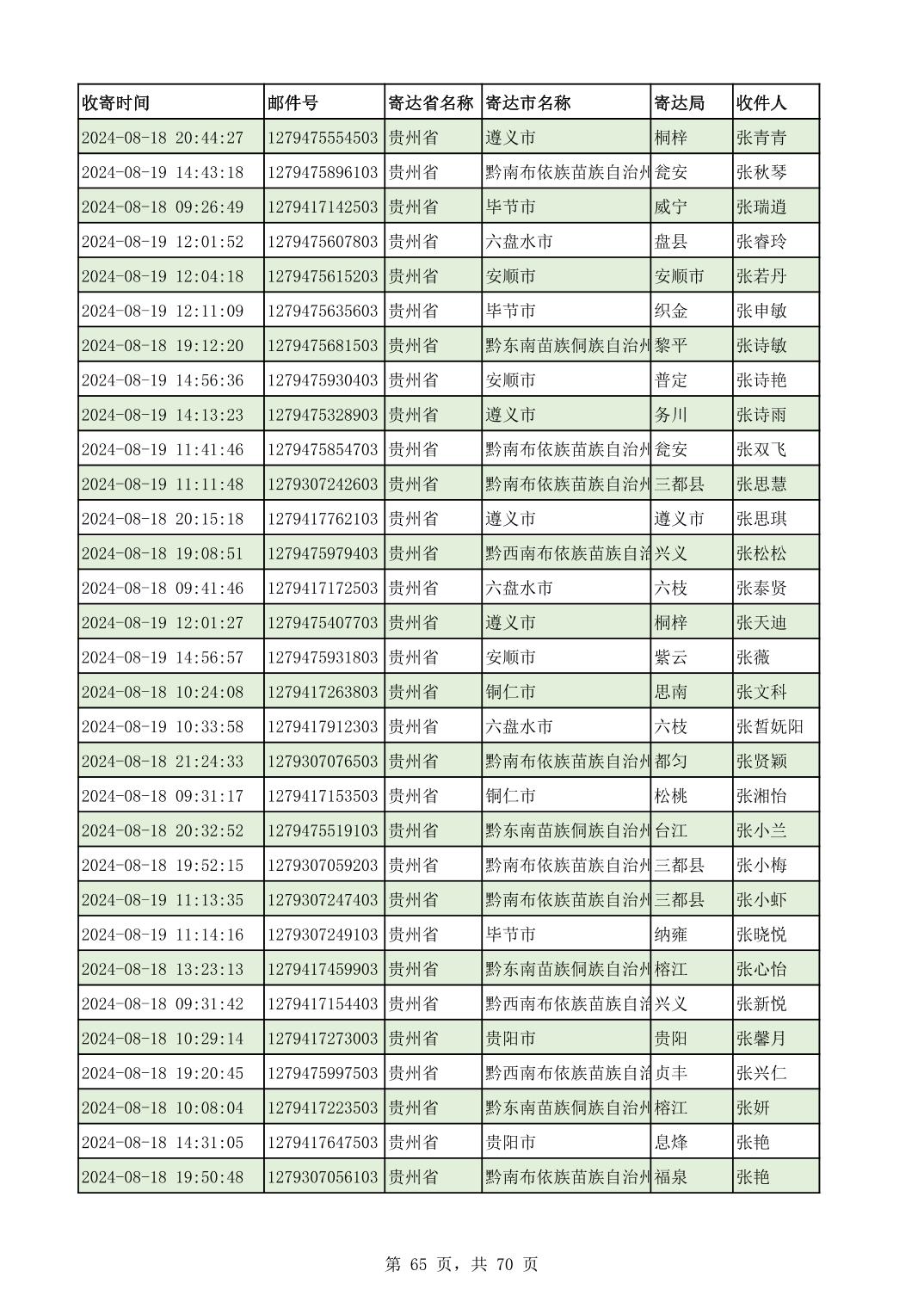 黔南幼专2024年录取通知书邮寄单号8月19日(按姓名拼音首字母排序)