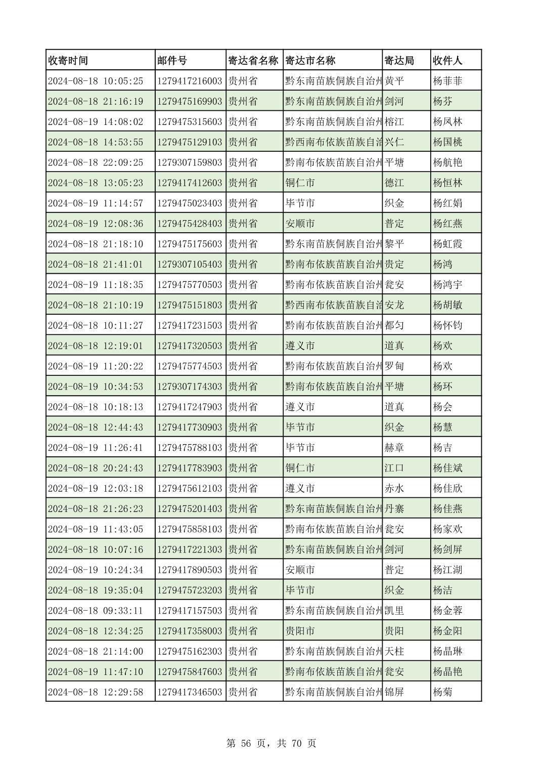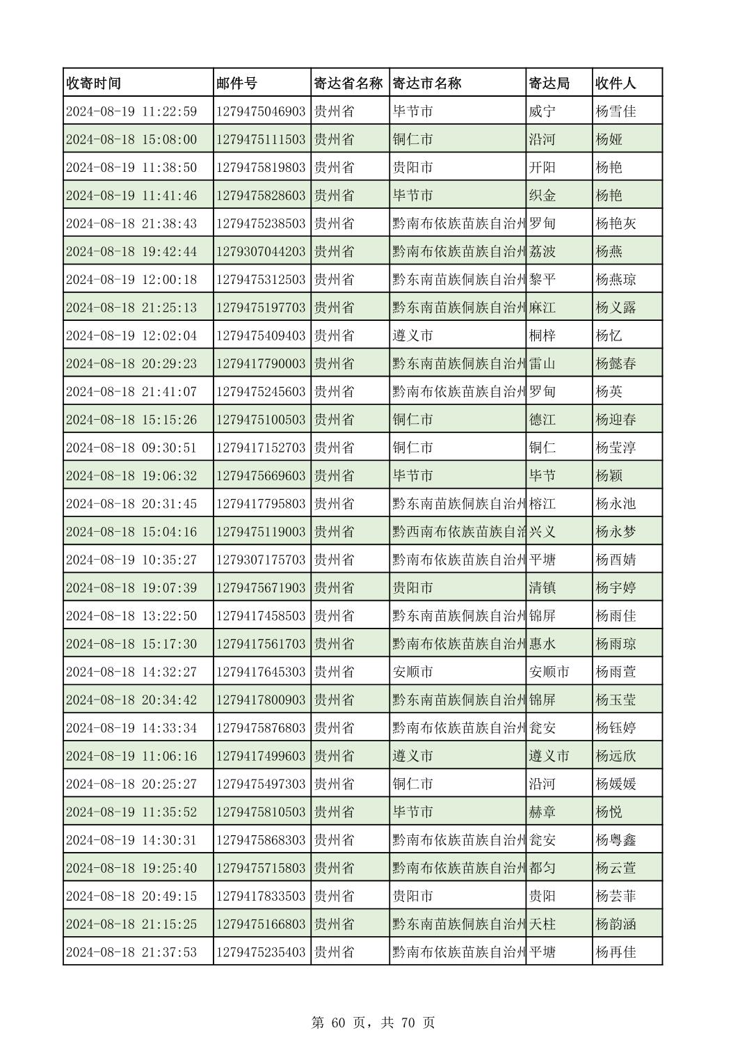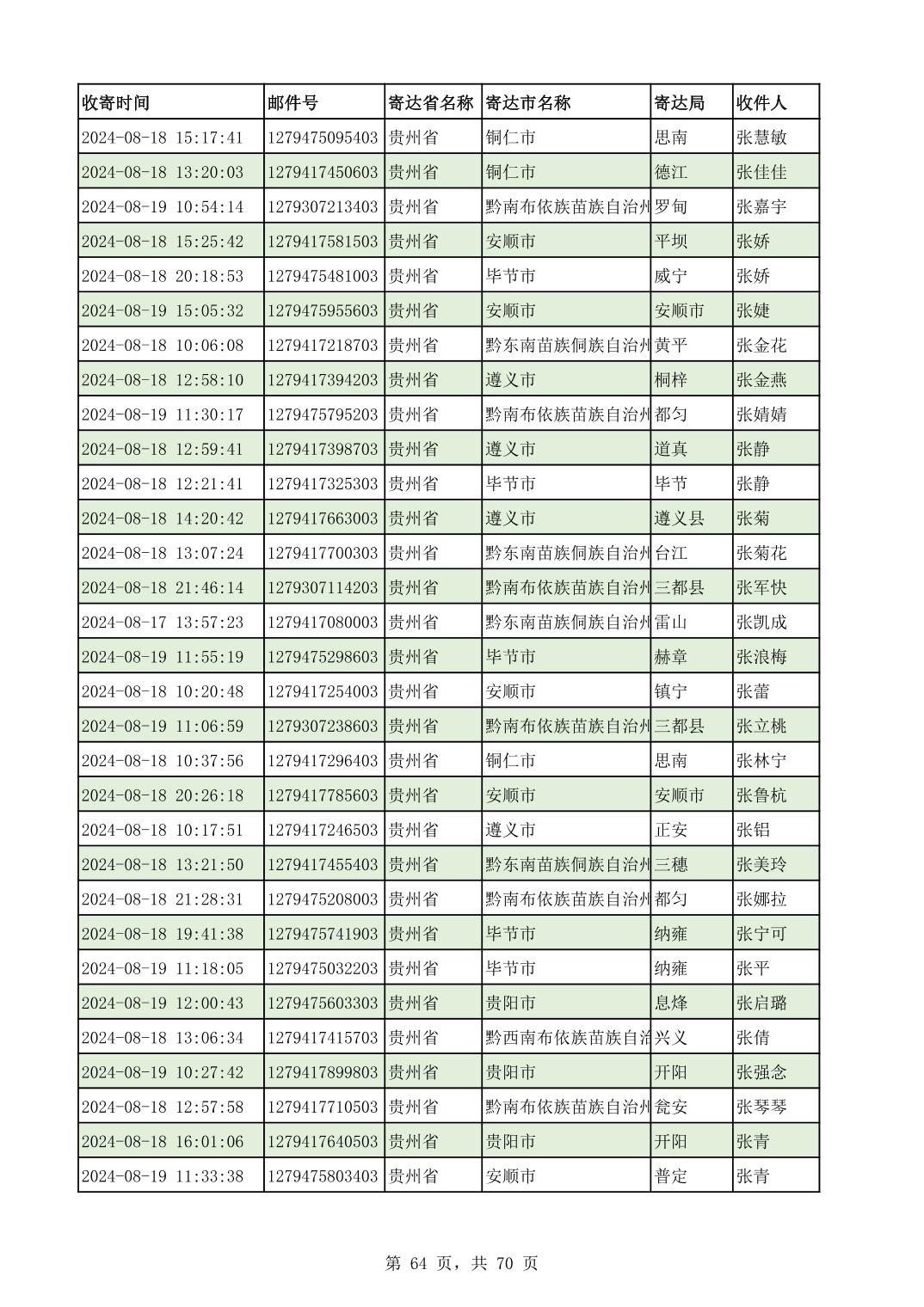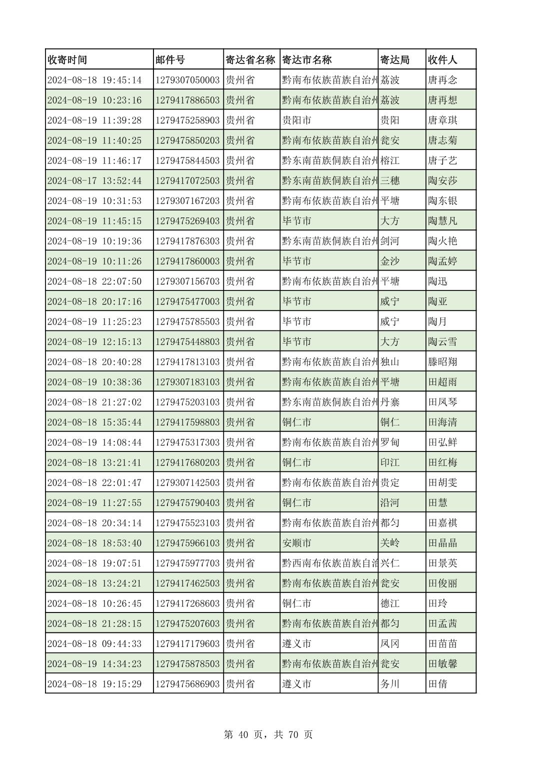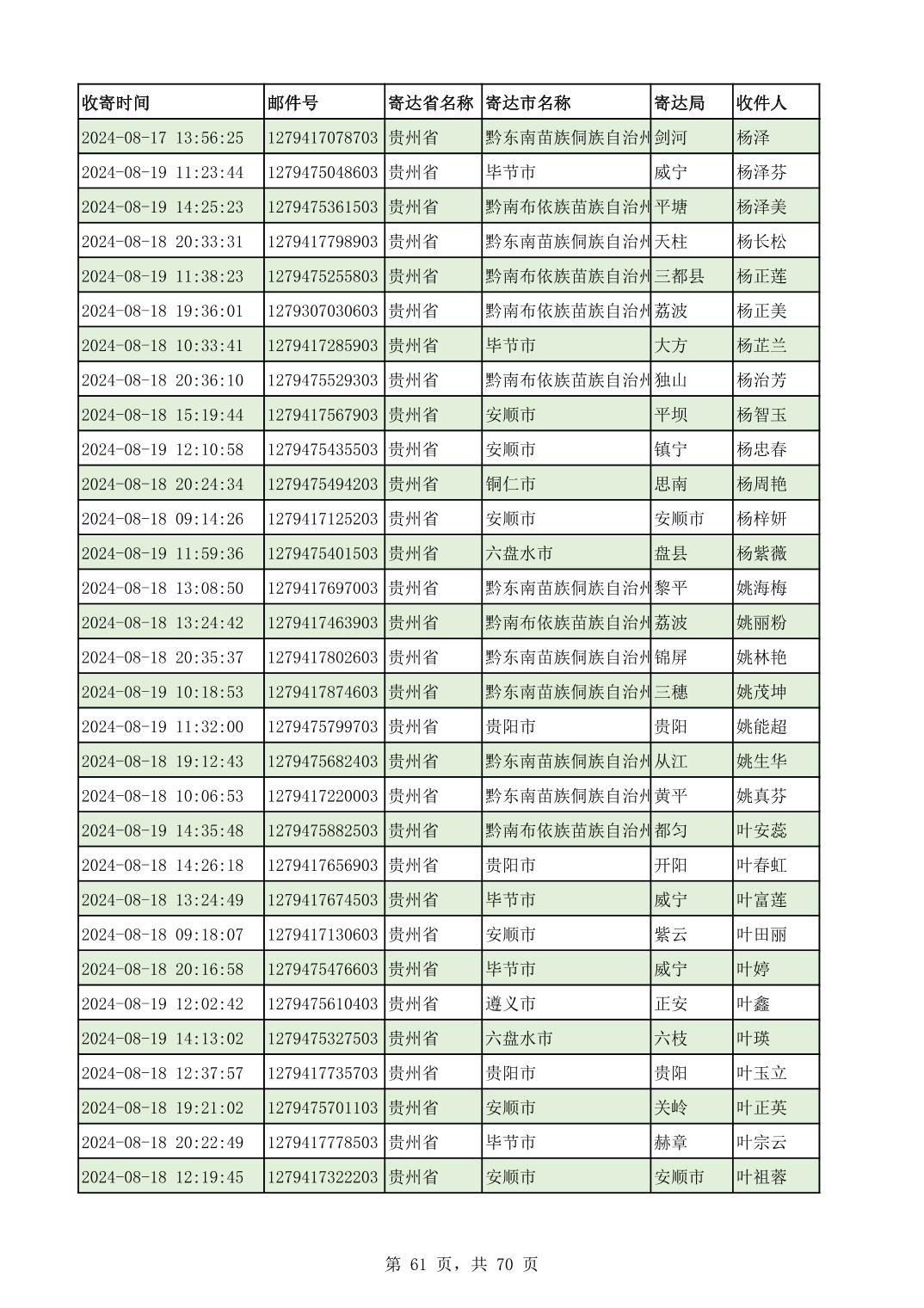 黔南幼专2024年录取通知书邮寄单号8月19日(按姓名拼音首字母排序)