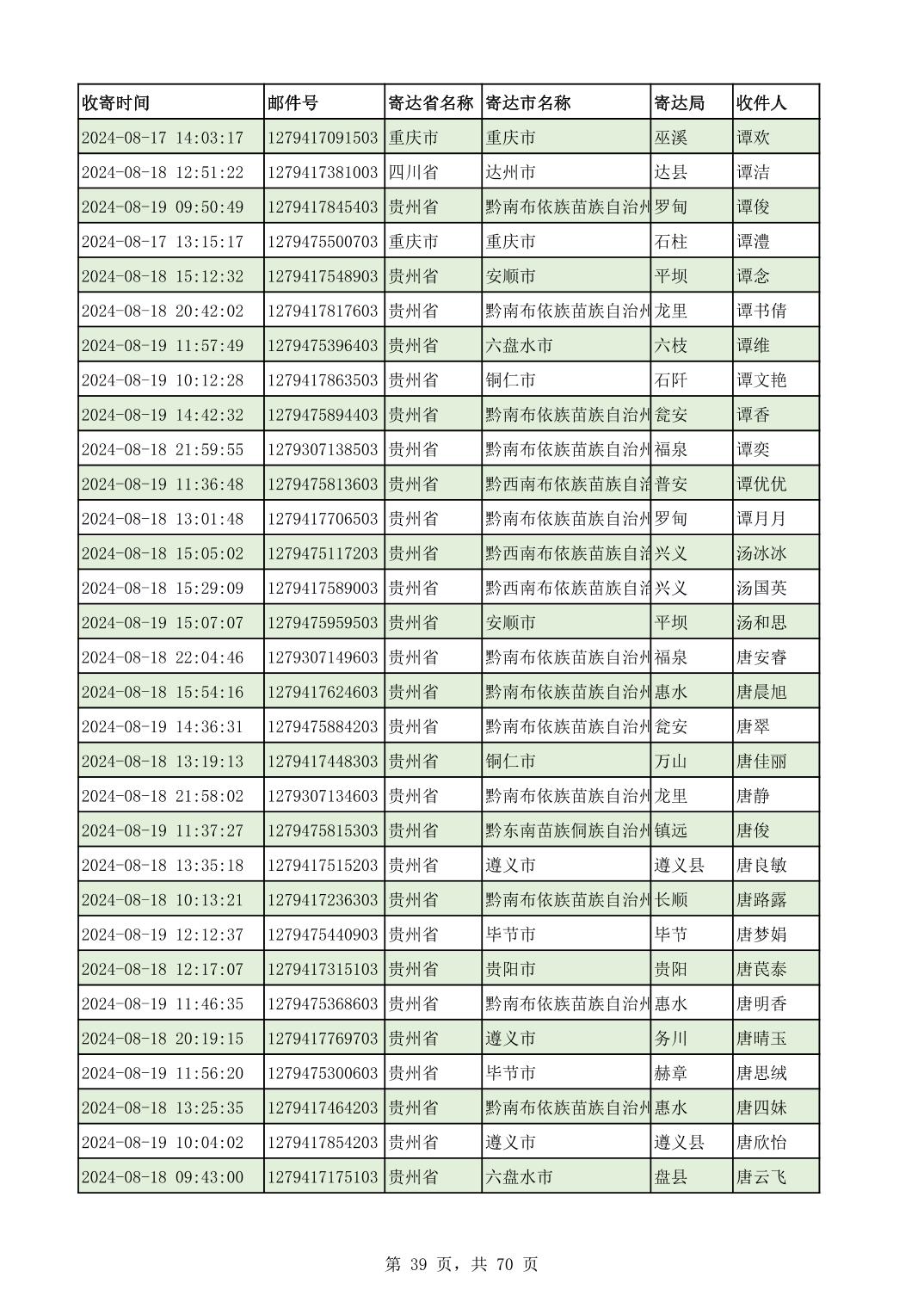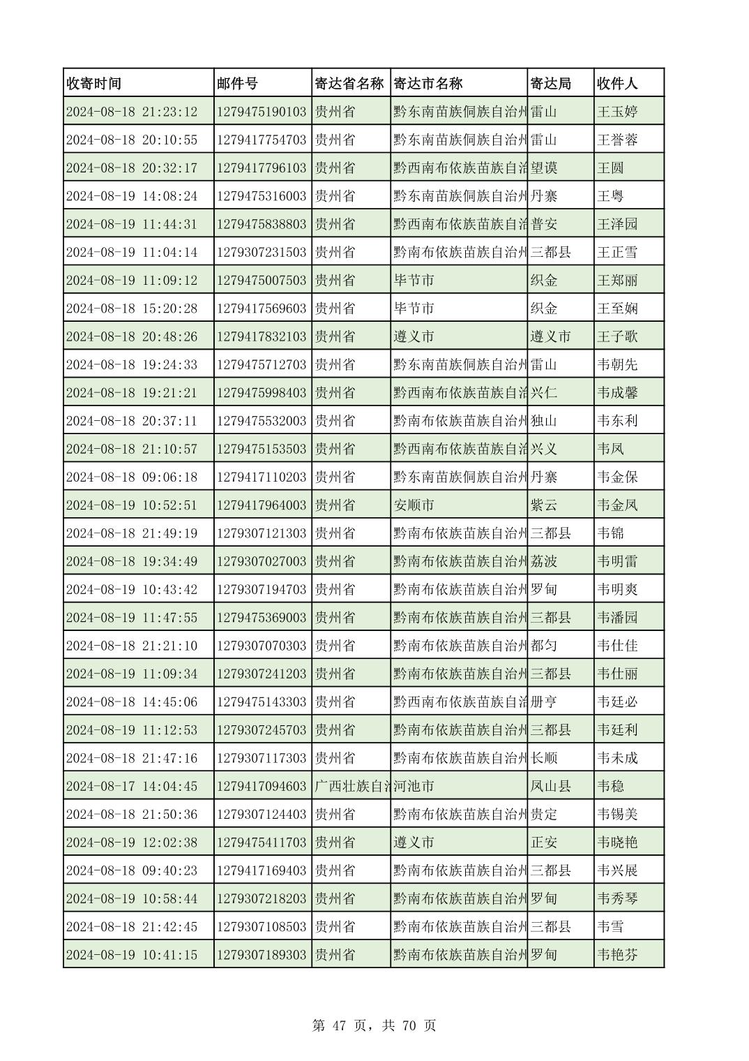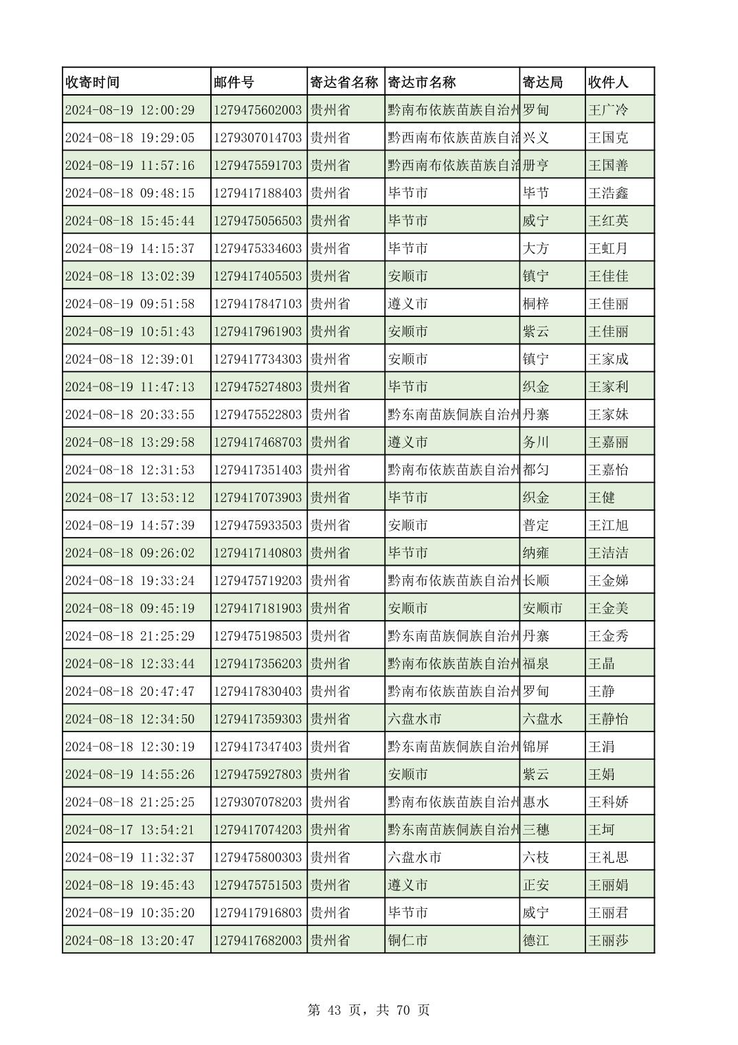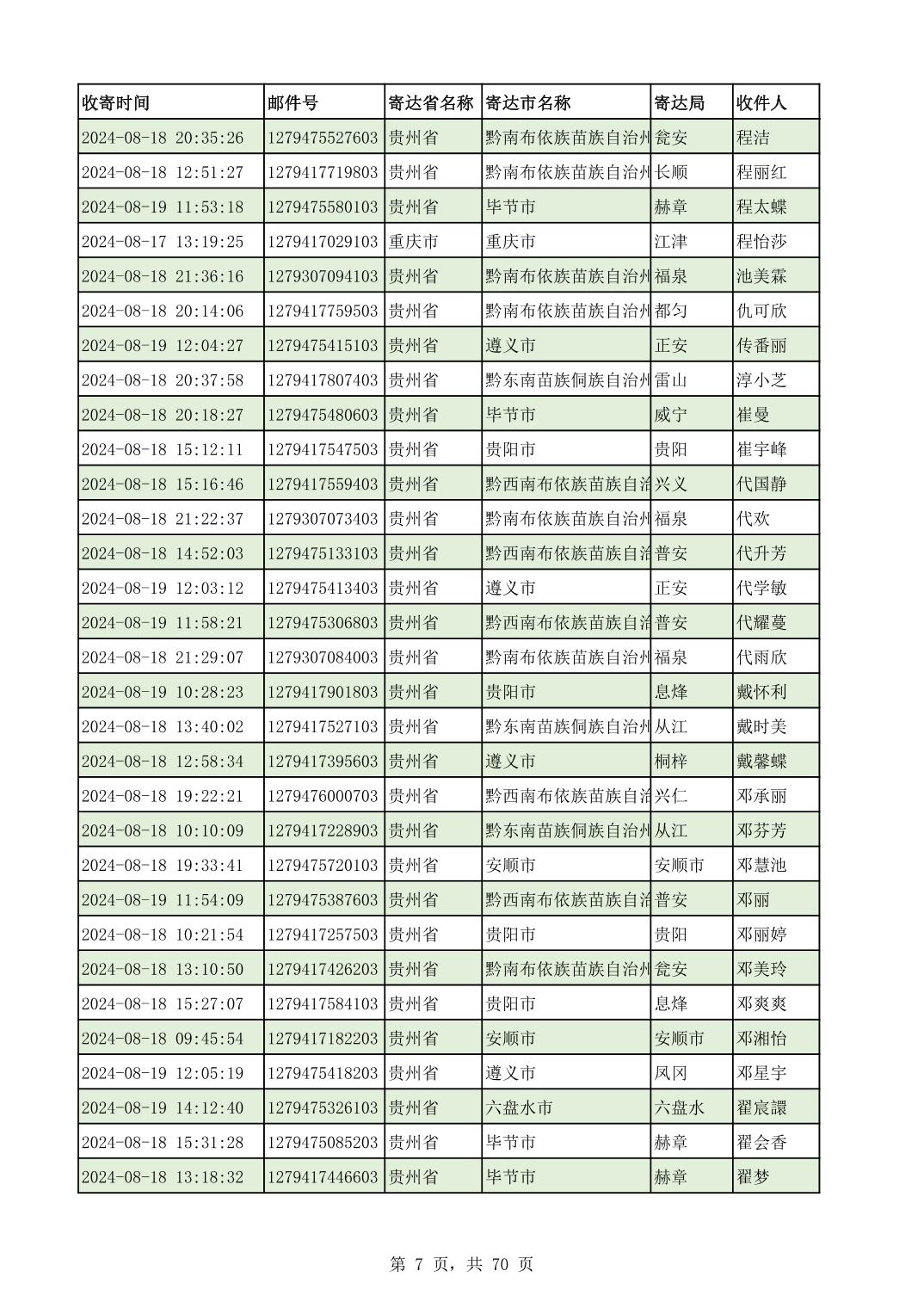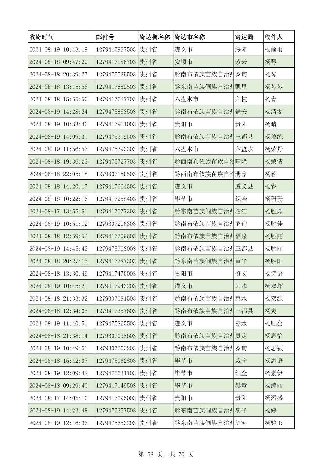 黔南幼专2024年录取通知书邮寄单号8月19日(按姓名拼音首字母排序)