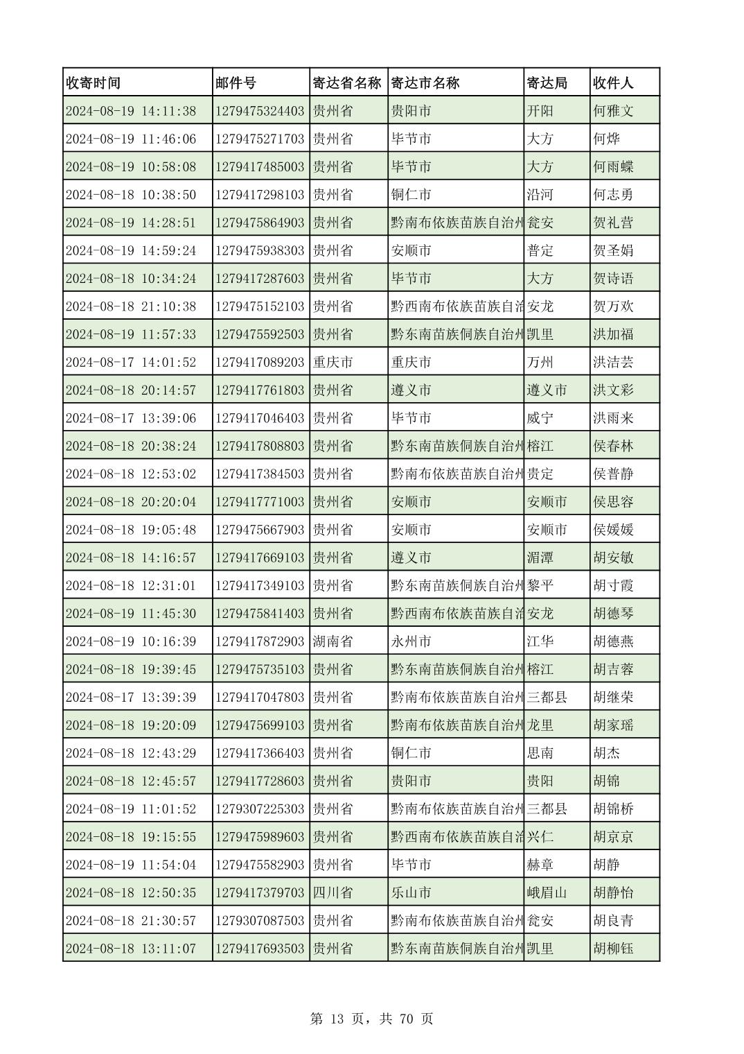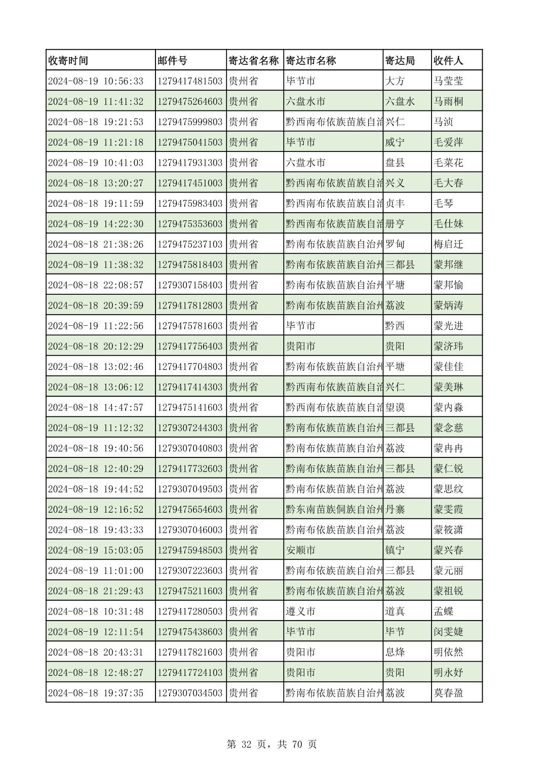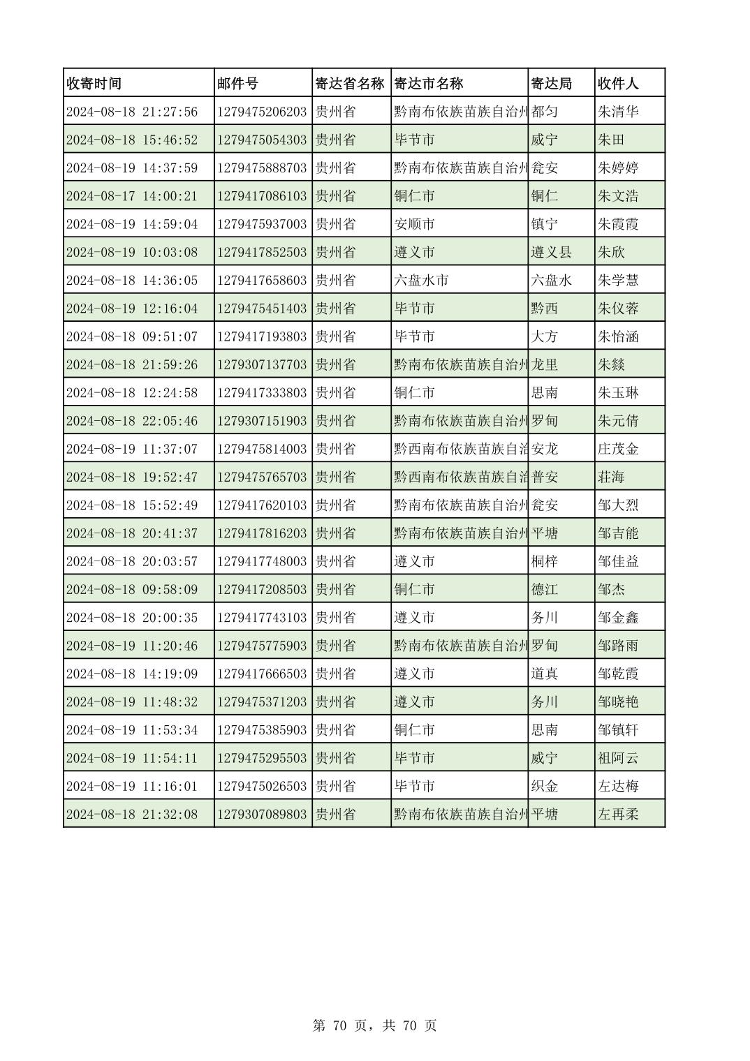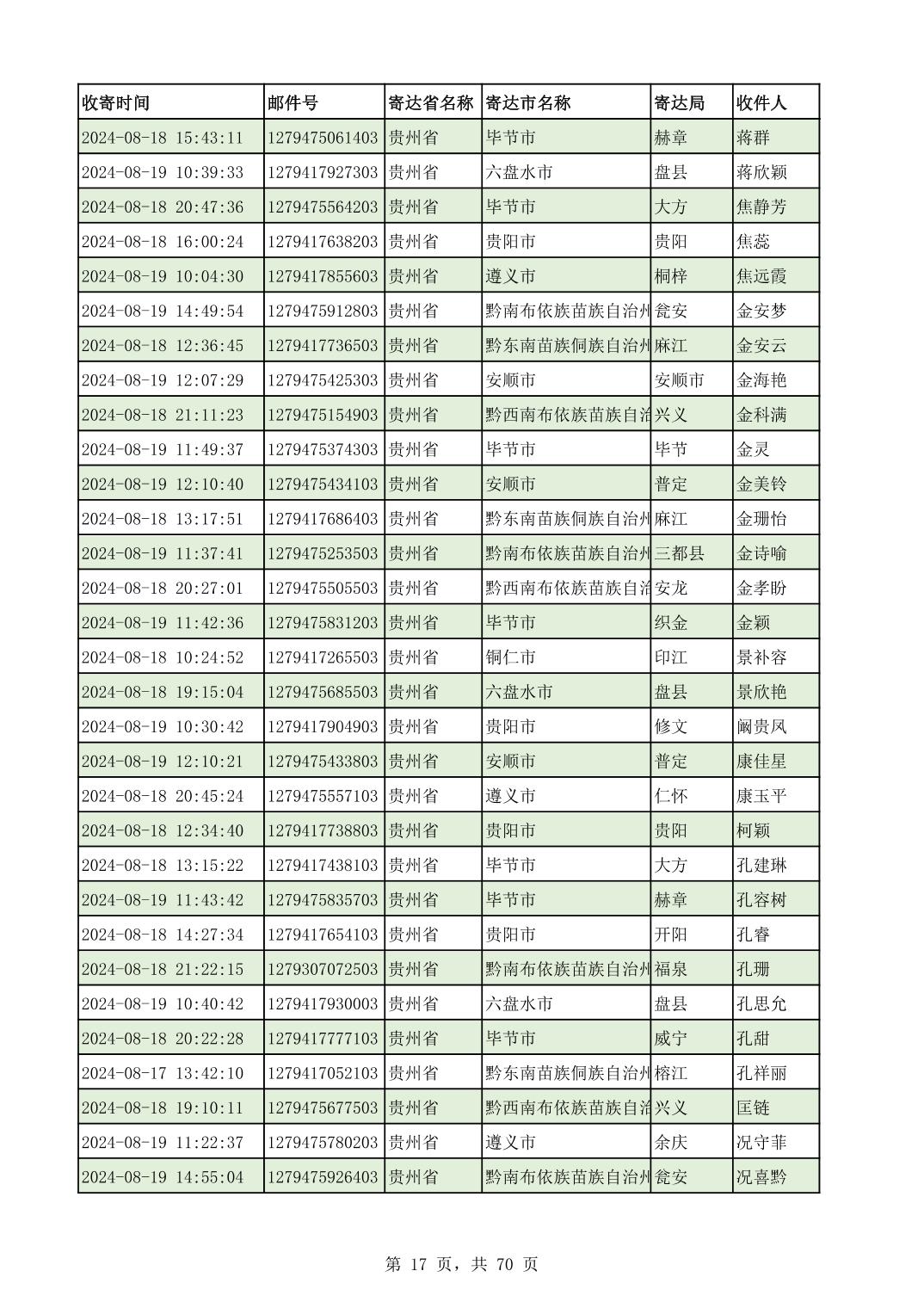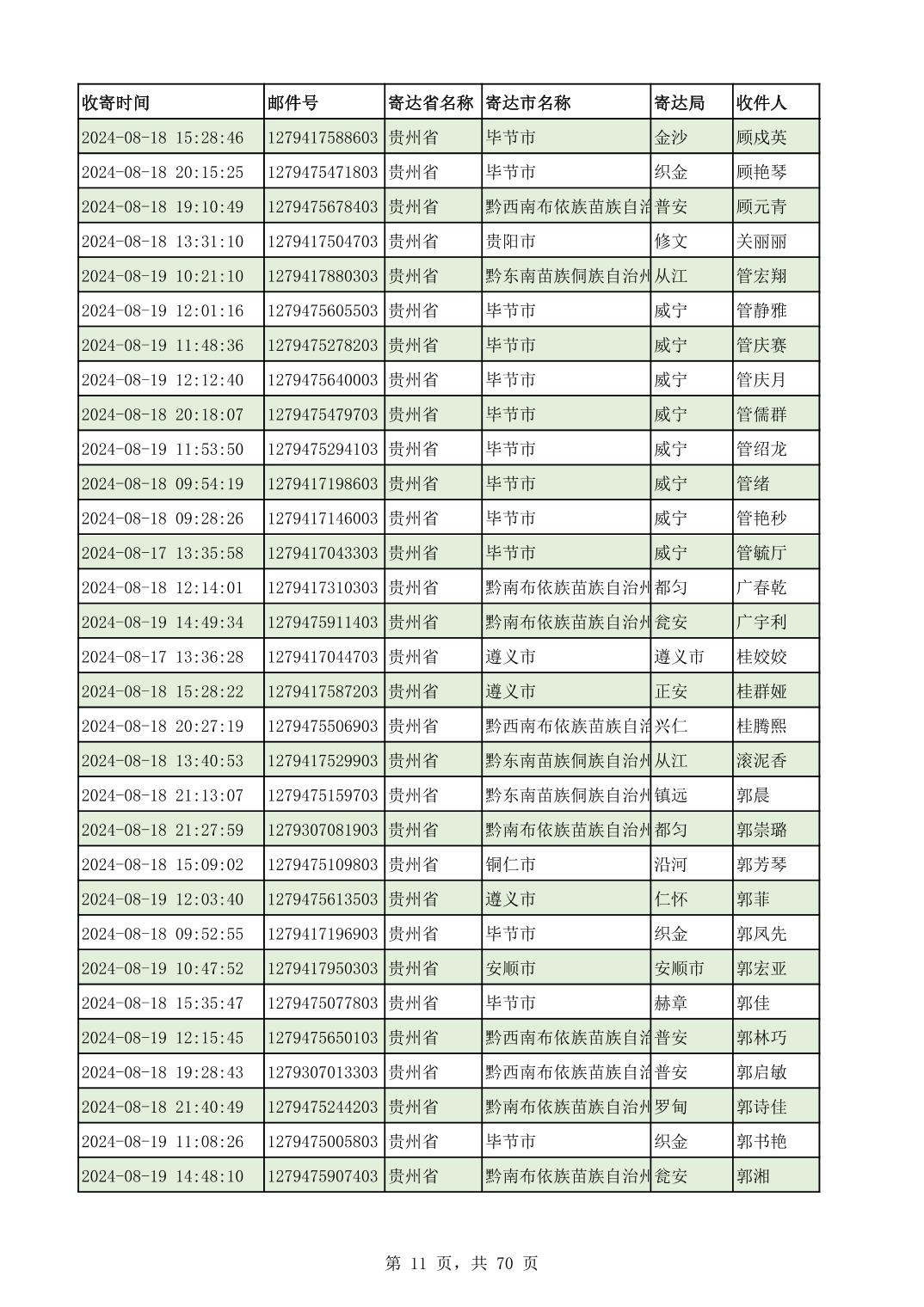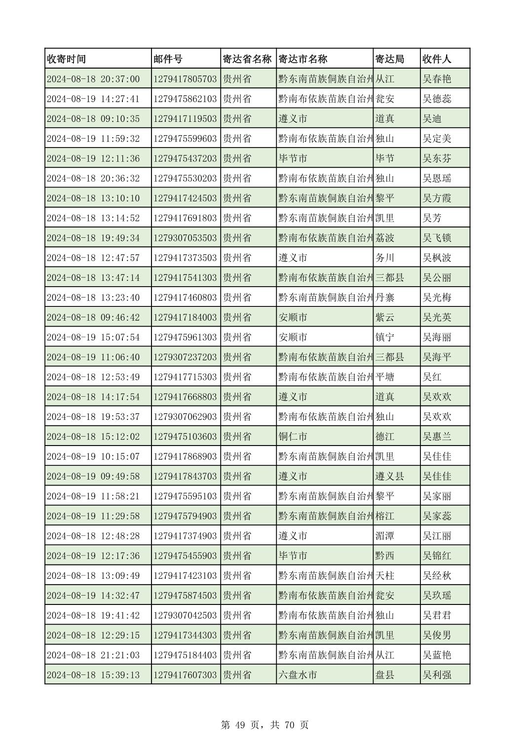 黔南幼专2024年录取通知书邮寄单号8月19日(按姓名拼音首字母排序)
