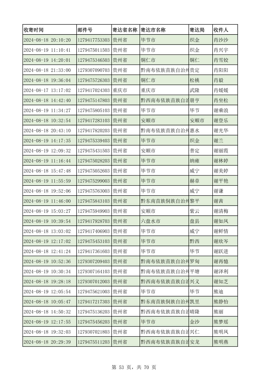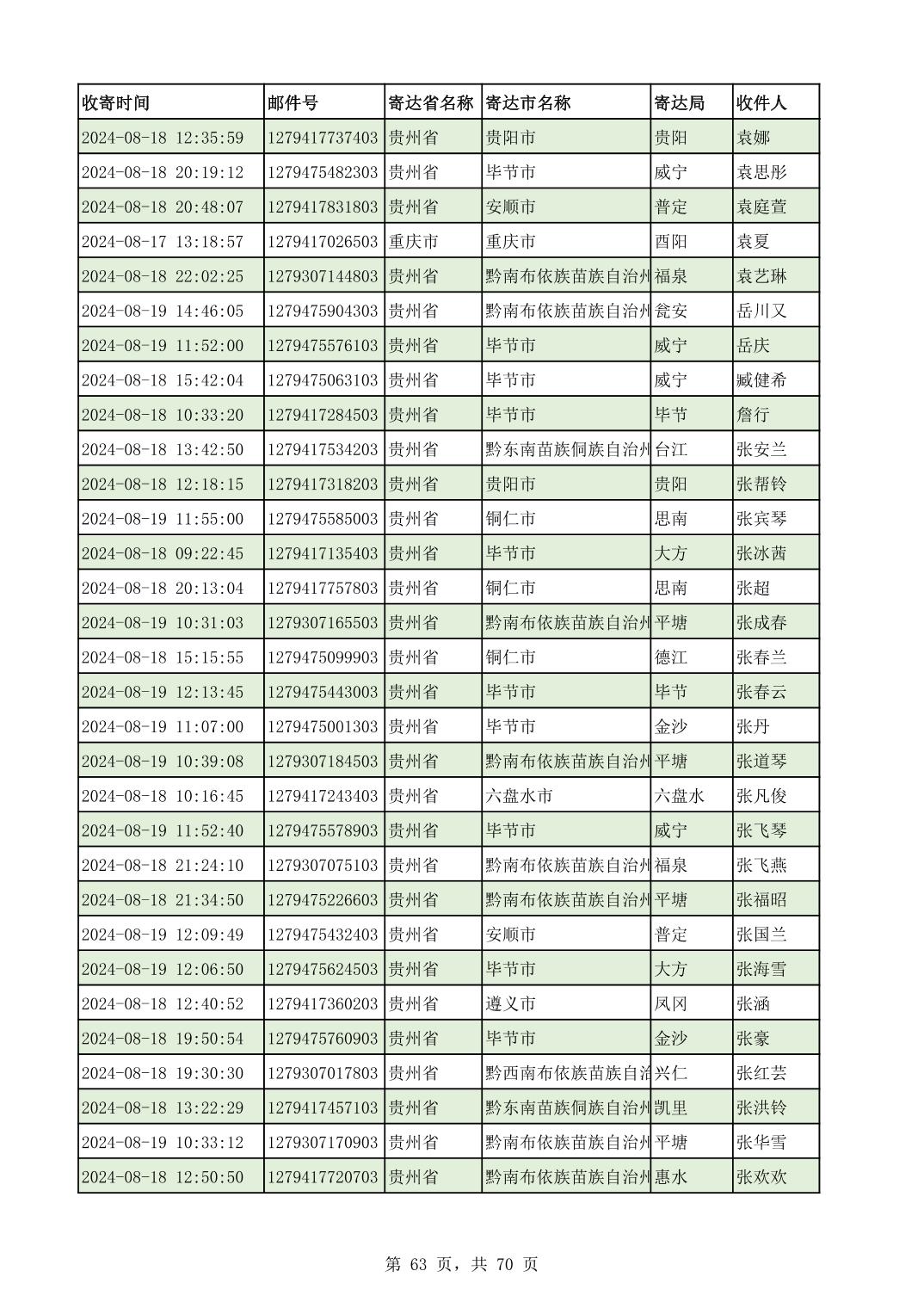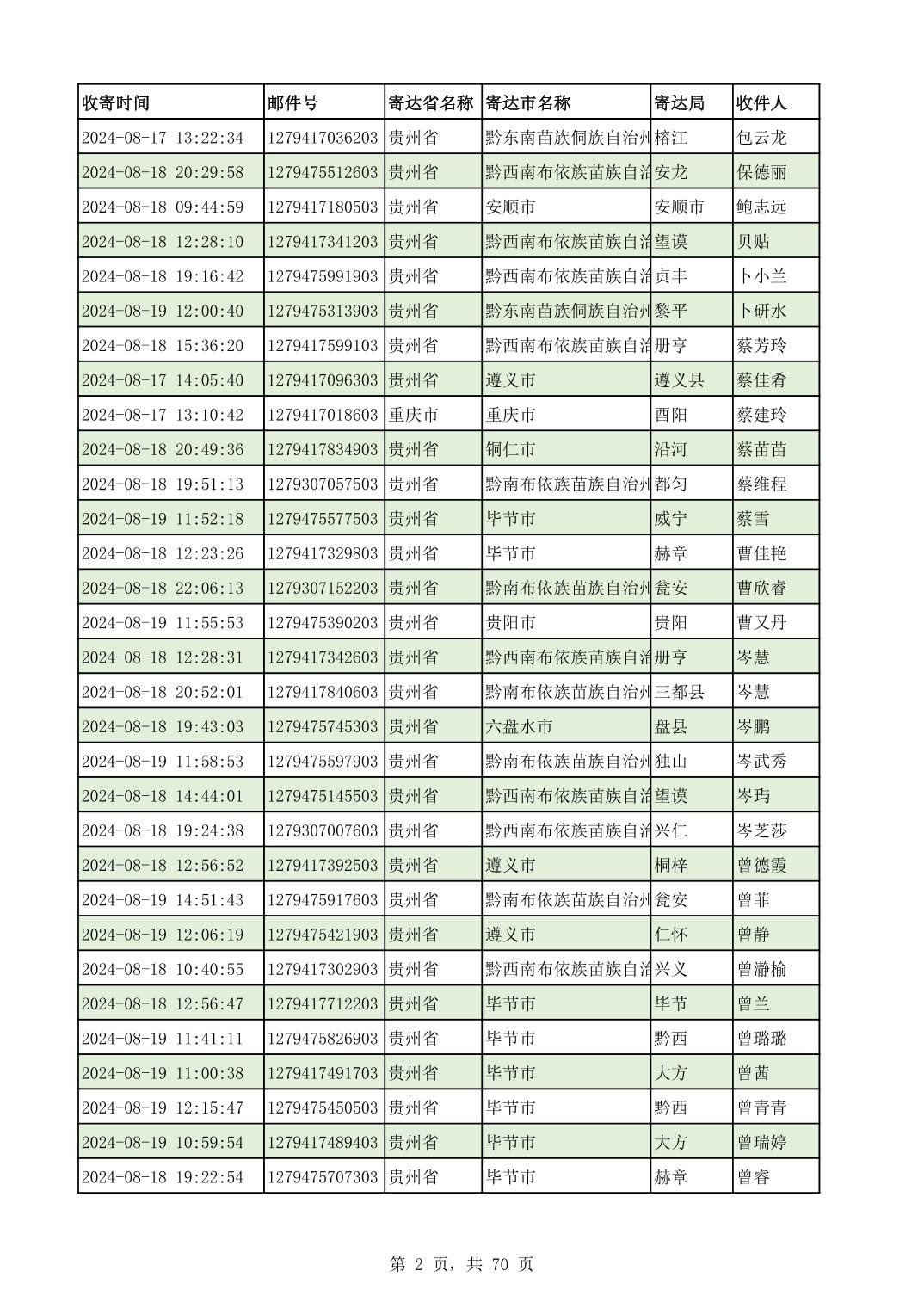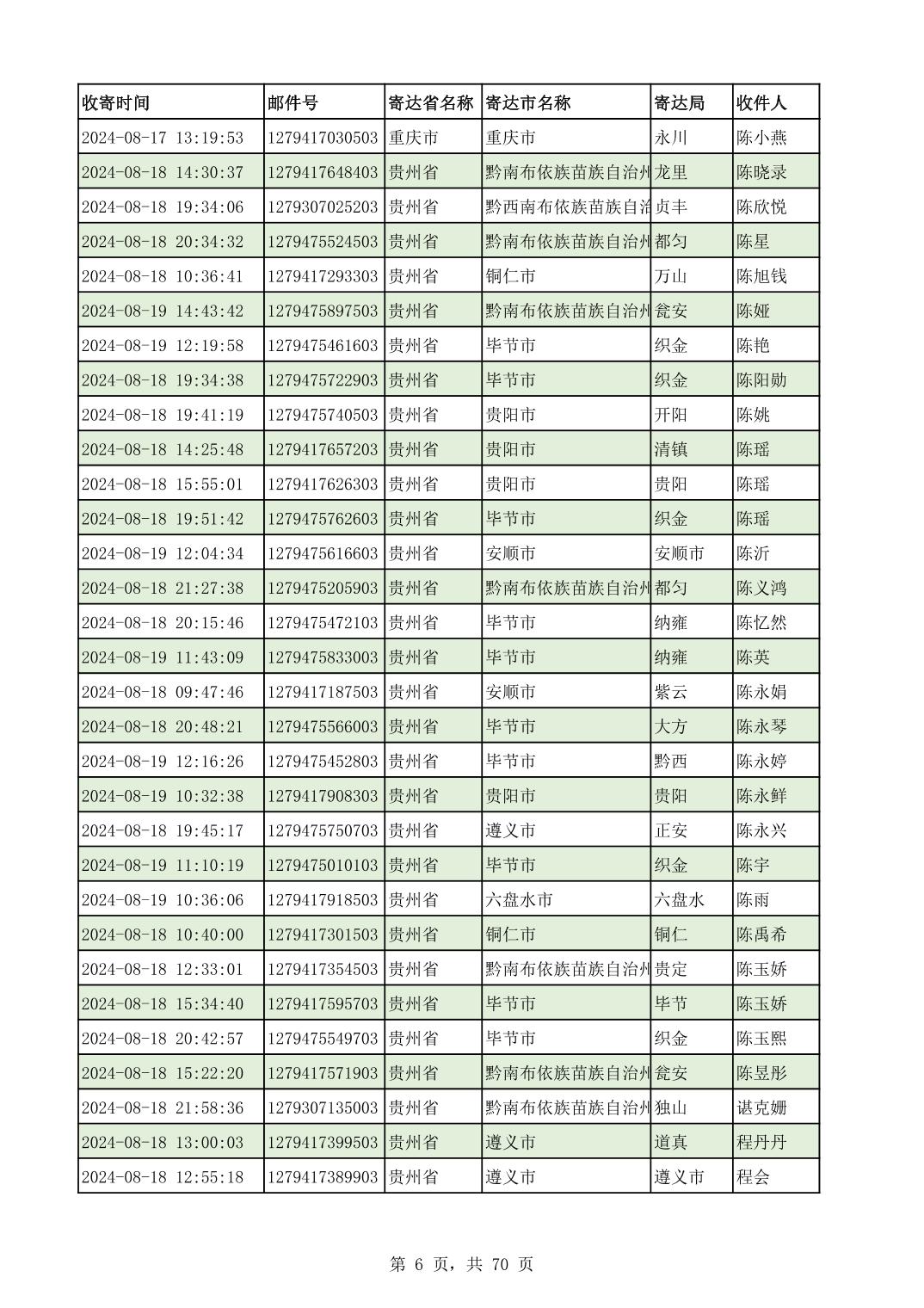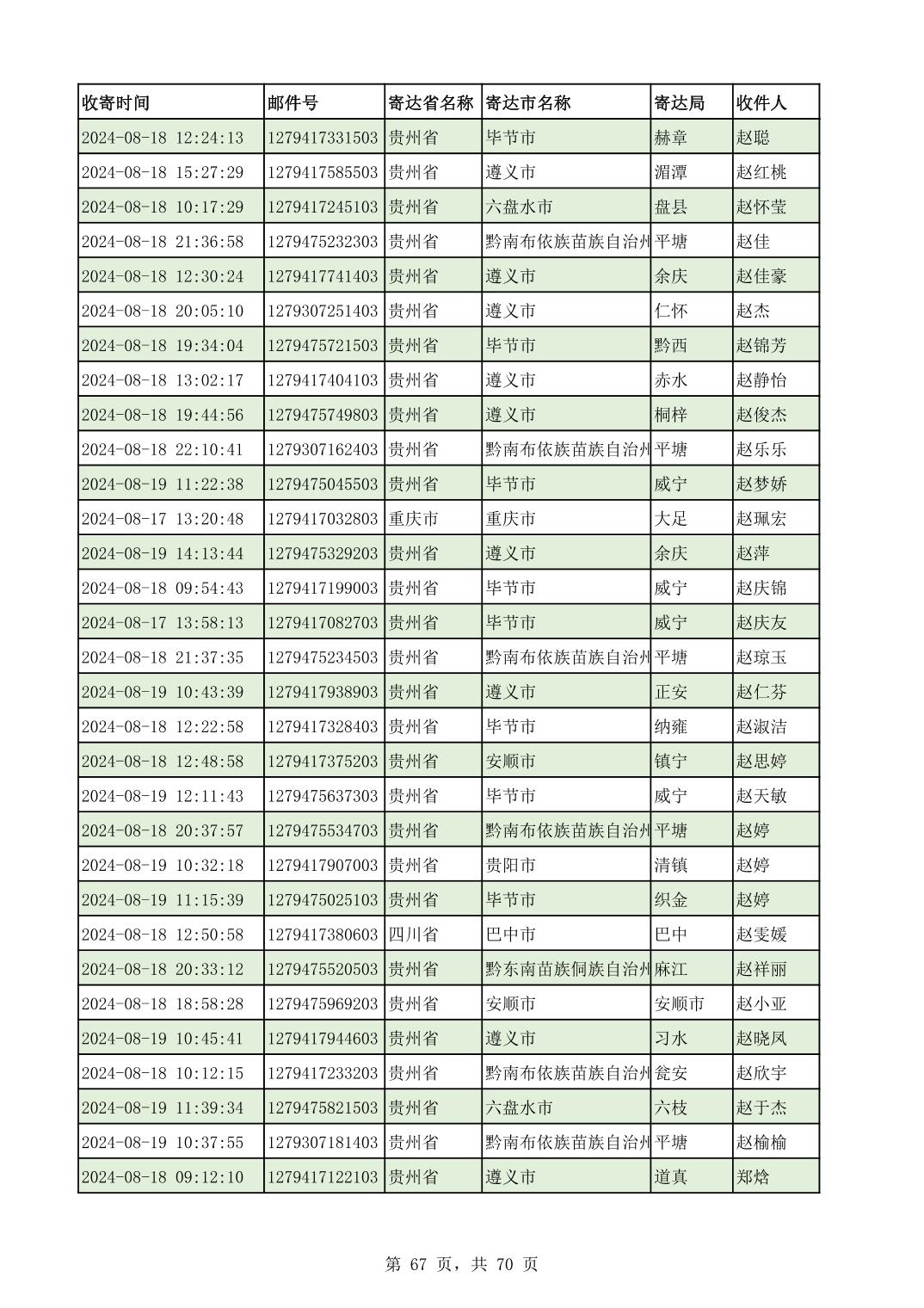 黔南幼专2024年录取通知书邮寄单号8月19日(按姓名拼音首字母排序)