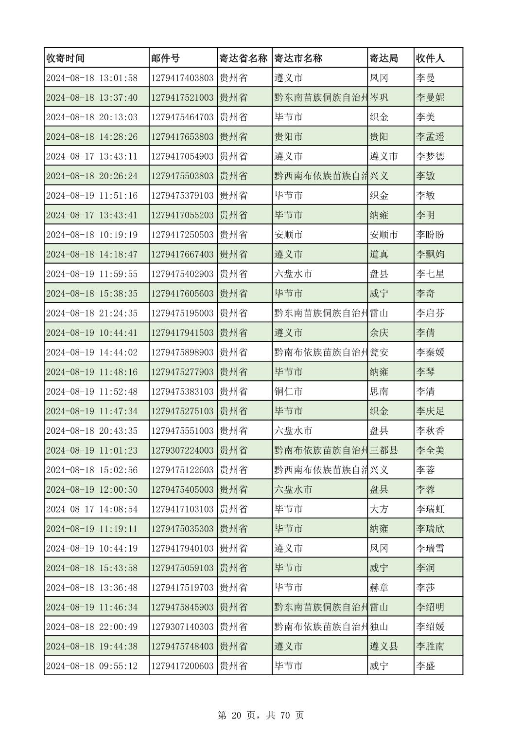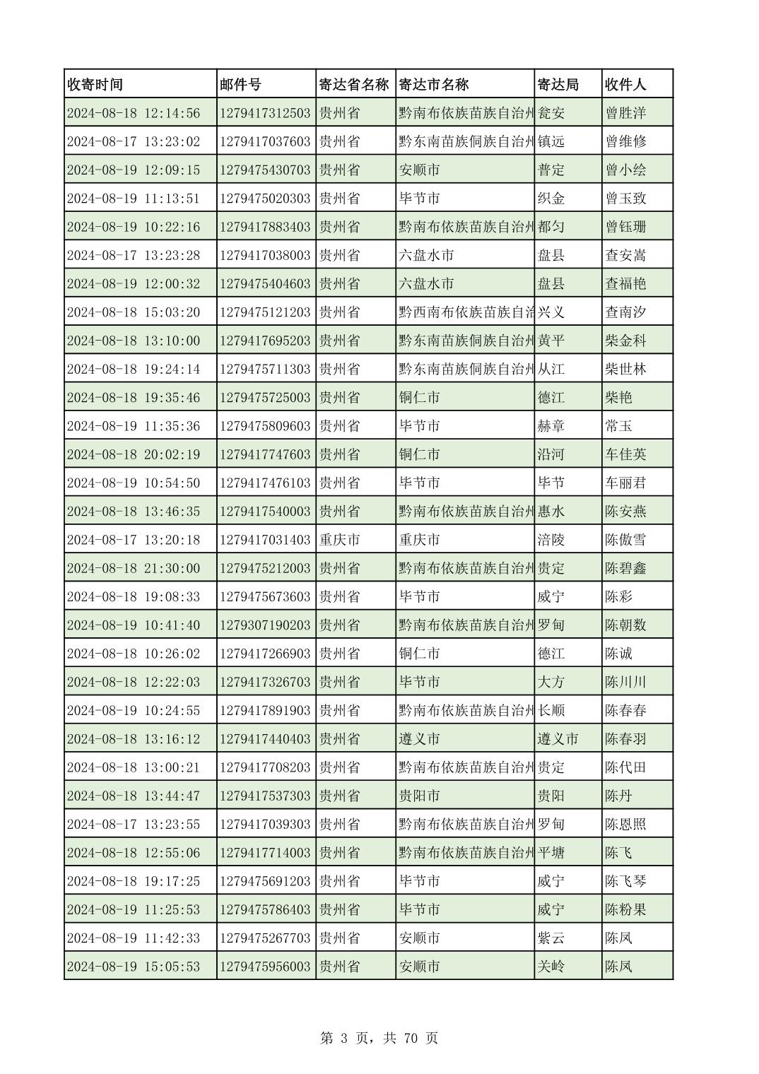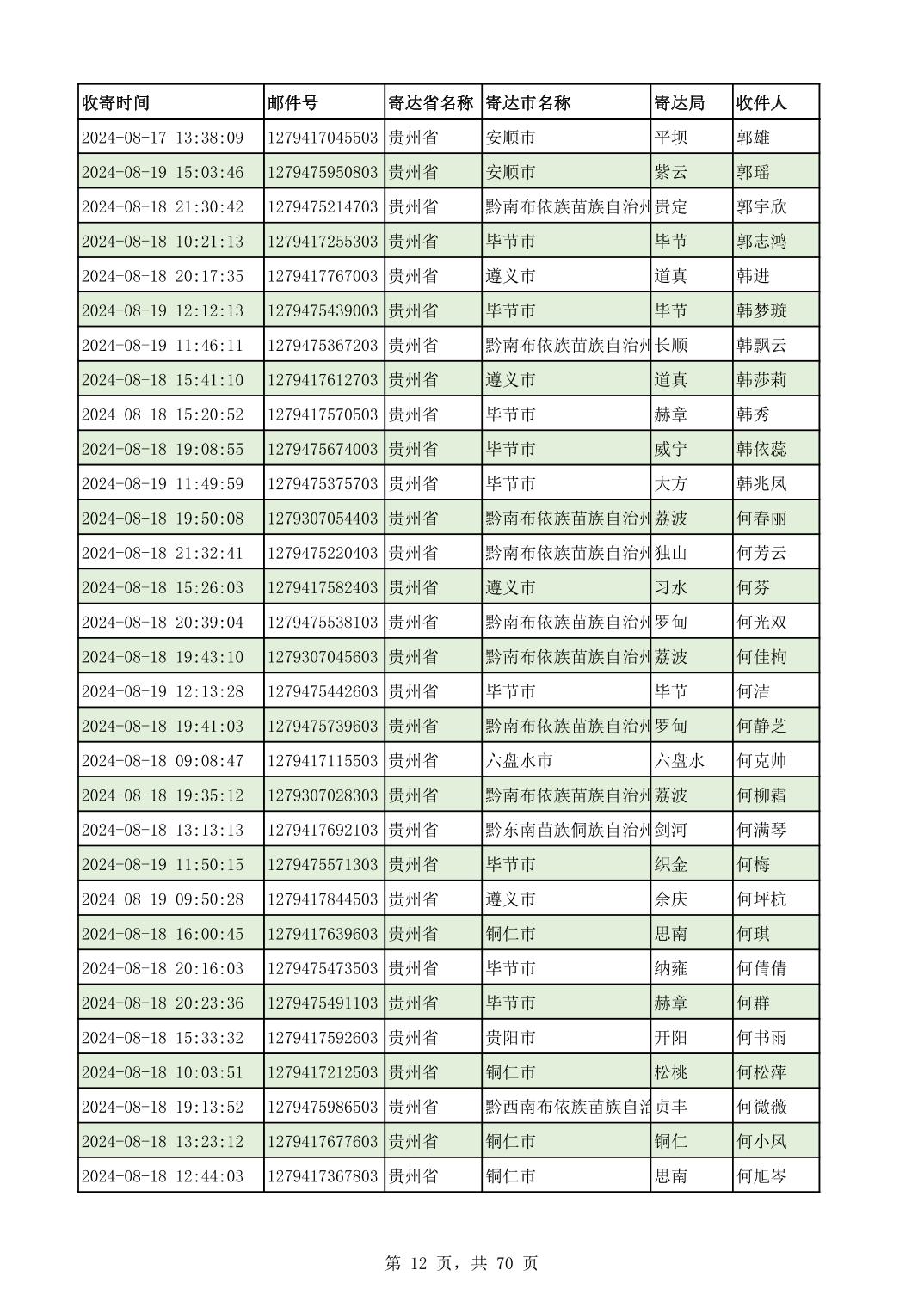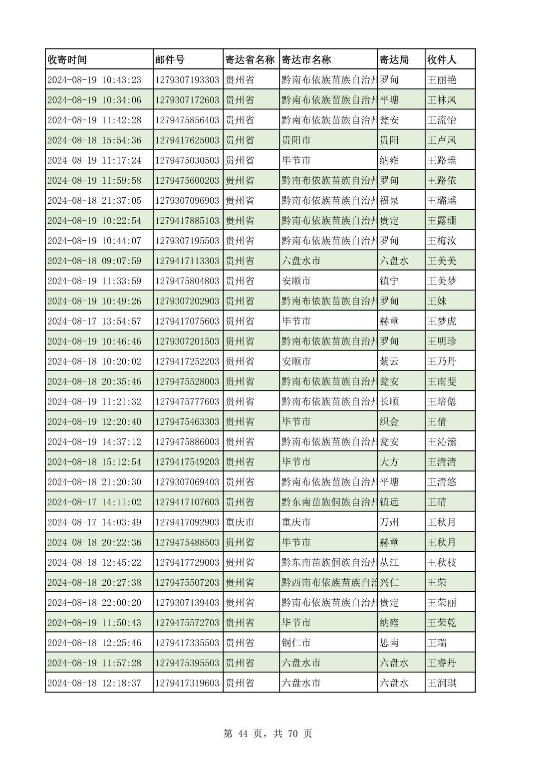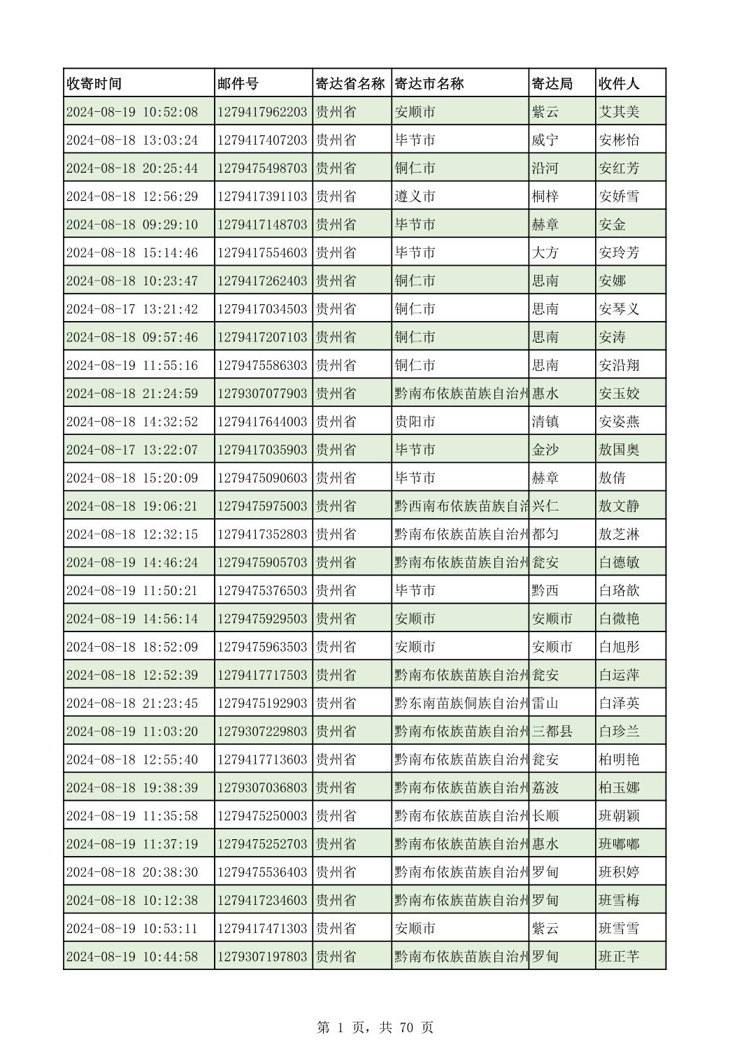 黔南幼专2024年录取通知书邮寄单号8月19日(按姓名拼音首字母排序)